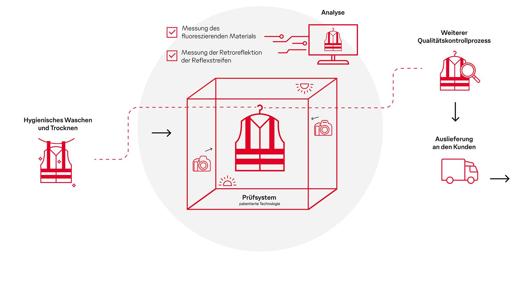Mit dem verbesserten Prüfprozess erreicht die Qualitätskontrolle der Warnkleidung ein neues Sicherheitsniveau. Das digitale Verfahren wurde in Zusammenarbeit mit dem Fraunhofer Institut entwickelt und patentiert. Es ist auf dem Markt bislang einzigartig und erhielt in der Kategorie „Optische Technologie“ einen Platz auf der Bestenliste des Deutschen Industriepreises.