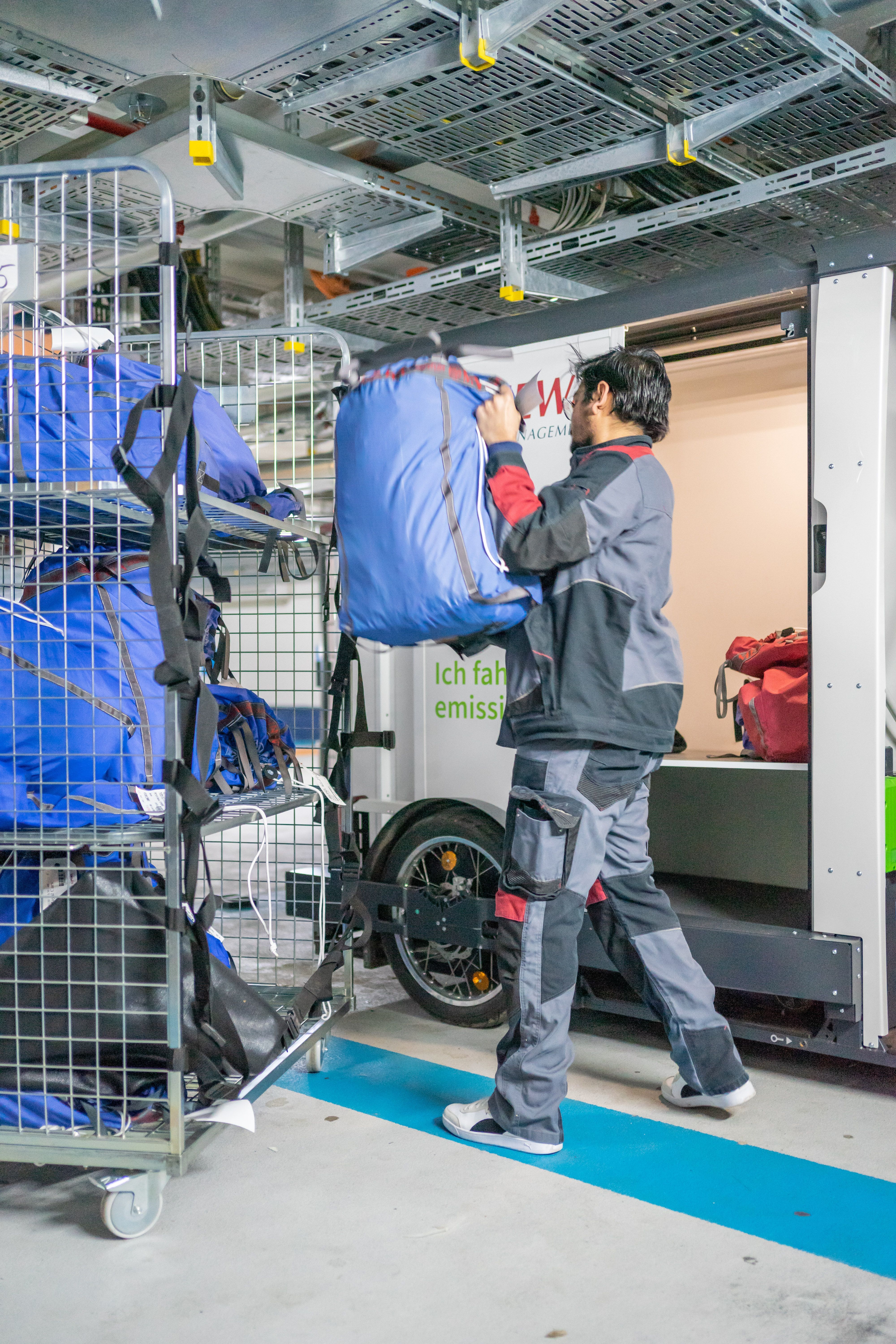 Die frisch gewaschene Arbeitskleidung kommt per E-Cargobike
